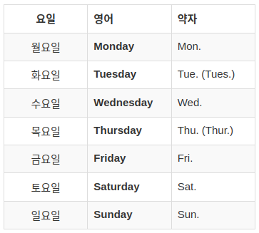 | 요일 | 영어 | 약자 |