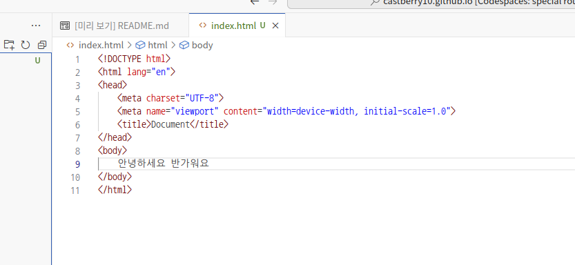 5. 코드스페이스에서 빨간 1, 2번을 눌러 index.html 파일을 누릅니다.