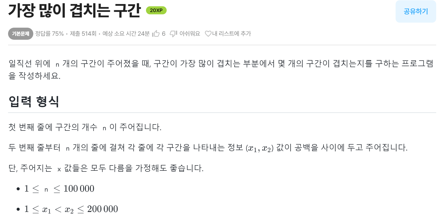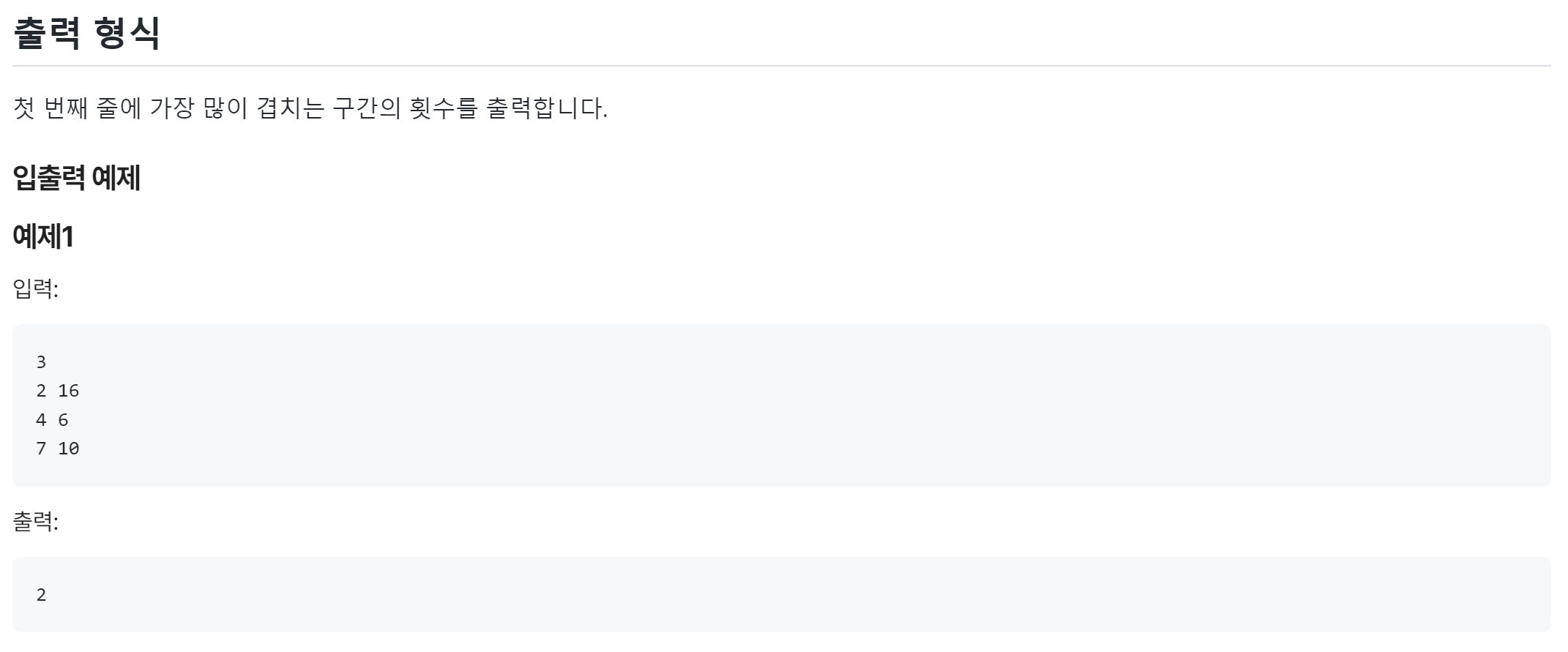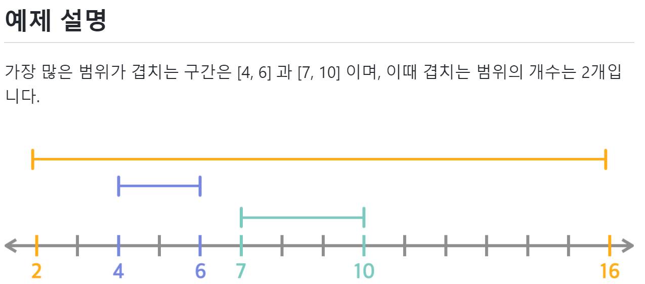 위 같이 선분이 주어지면 선분 튜플을 저장하는 리스트를 생성합니다. 선분 시작점은 1, 끝점은 -1로 정하고 리스트를 정렬한 뒤 임의의 변수에 더하면서 좌표의 처음부터 끝까지 max 값을 체크하면 되는 문제입니다.