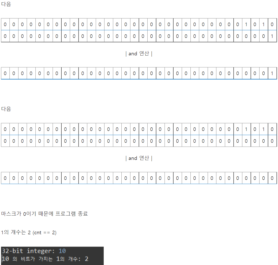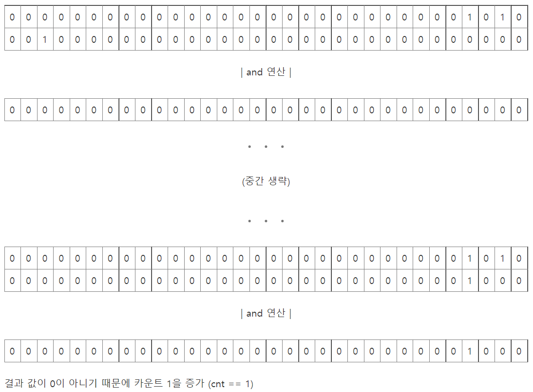 - and 연산이 0 이상이라면 마스크의 1 부분은 정수에도 1이 있다는 뜻이기 때문에 카운트를 증가