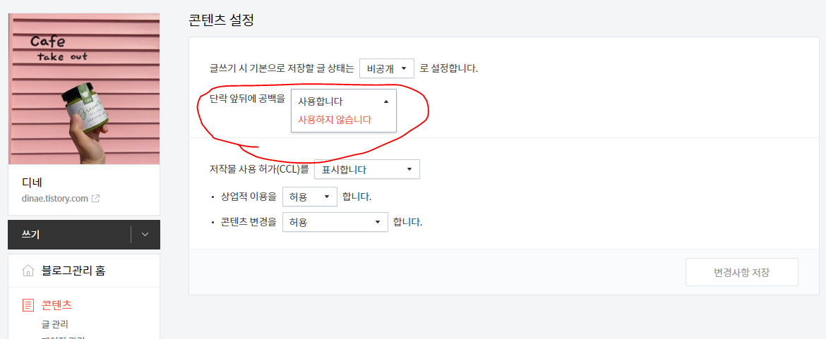 2. 위 동그라미 안이 기본값으로는 [사용합니다]일텐데 [사용하지 않습니다]로 바꾼다.
