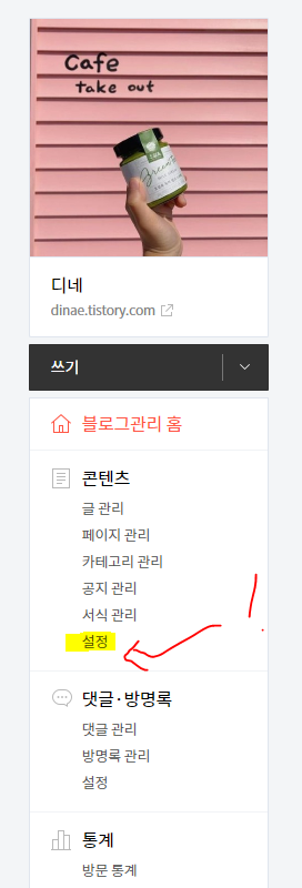 1. 관리자 페이지 왼쪽 메뉴바에서 콘텐츠 -> 설정으로 들어간다.